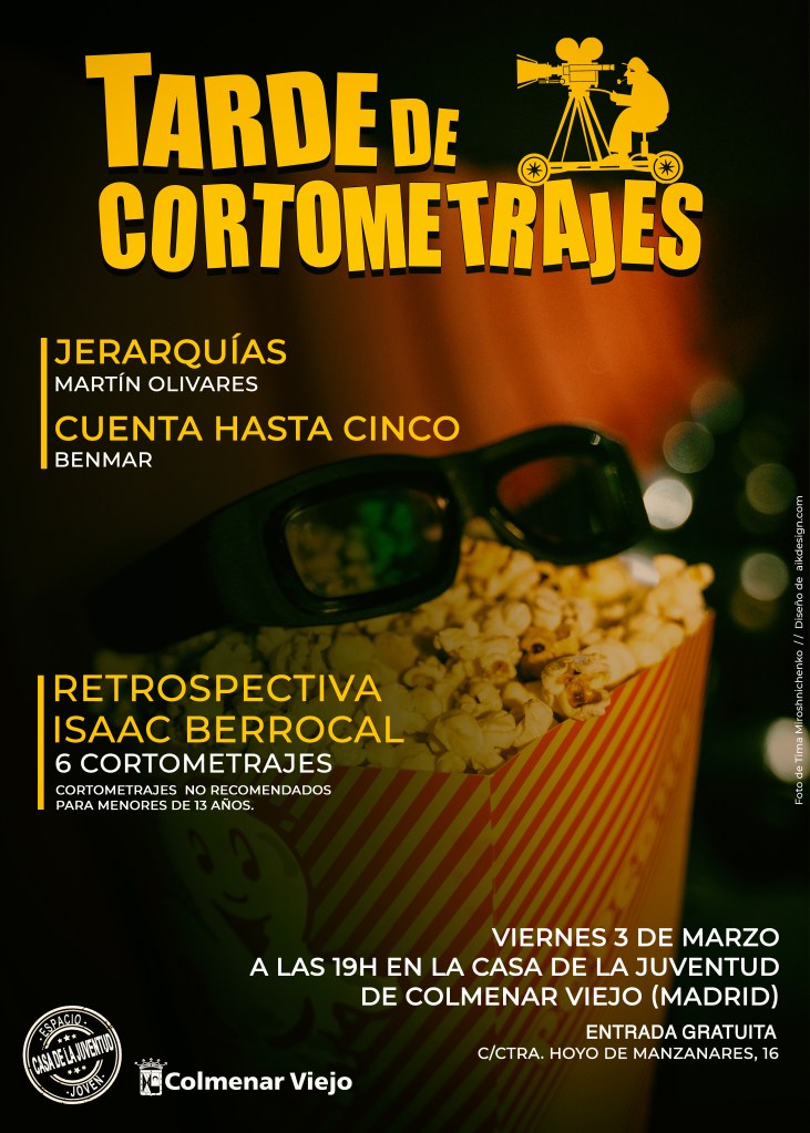 El viernes 3 de marzo se hará una pequeña retrospectiva sobre mis trabajos de cortometraje en La Casa de la Juventud de Colmenar Viejo, lugar donde he crecido artísticamente y que siempre me acogió y apoyó sin contemplaciones.